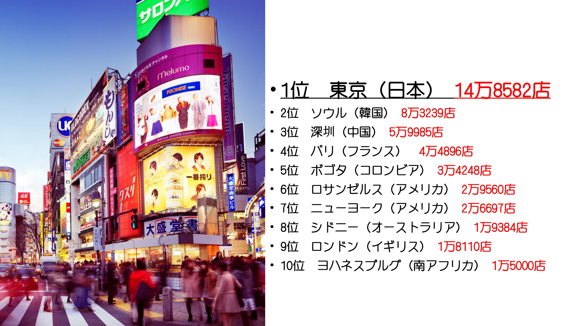 世界都市別レストラン数ランキング1位は、なんと東京!
